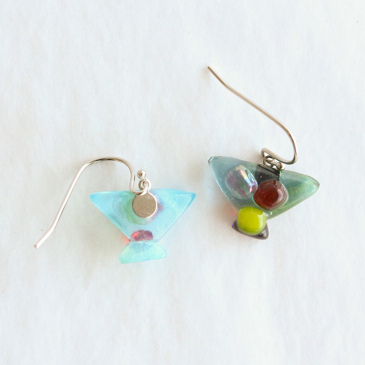 岡田さんが自身の作品の中からモチーフを選んで、小さなガラスを組み合わせて作った一点物です。優しい色合いとガラスの輝きがとても素敵な一品で、左右それぞれの魅力をお楽しみいただけます。